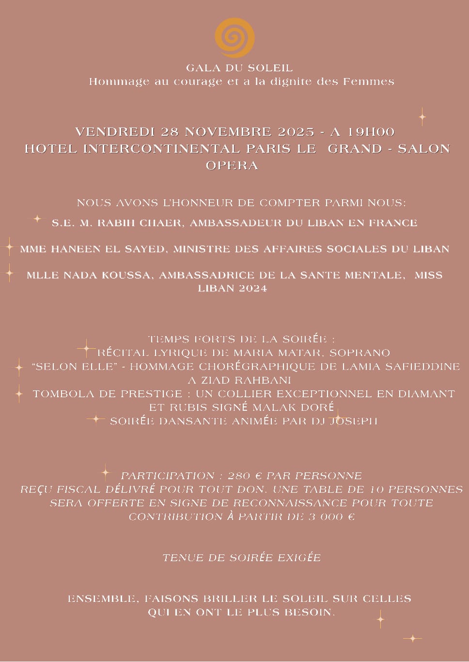 Votre participation à notre dîner de gala de collecte de fonds au profit du projet Femmes du Soleil est profondément appréciée.