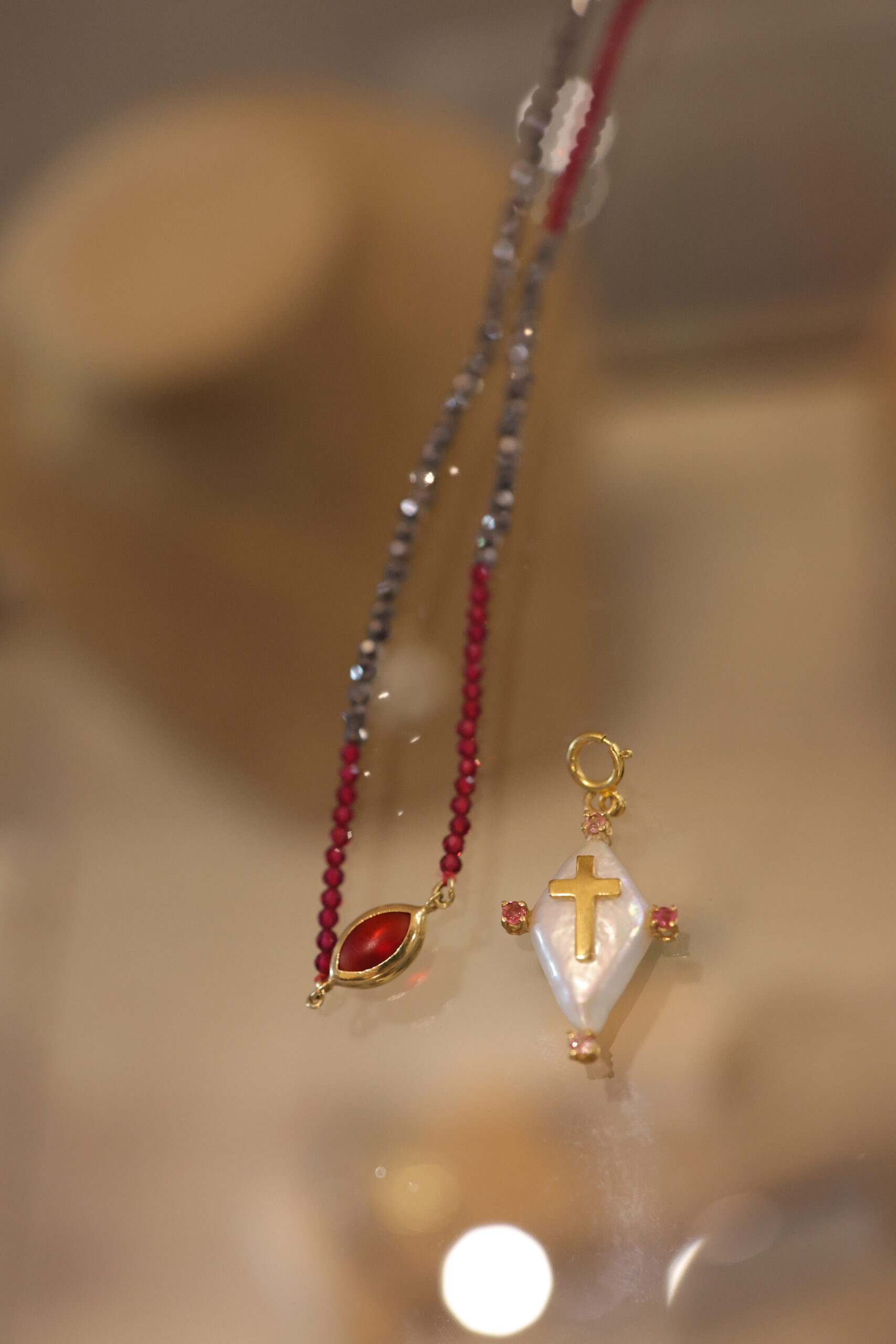 Hematites And Rubis Stones Necklace With Gold Heart And Cedar